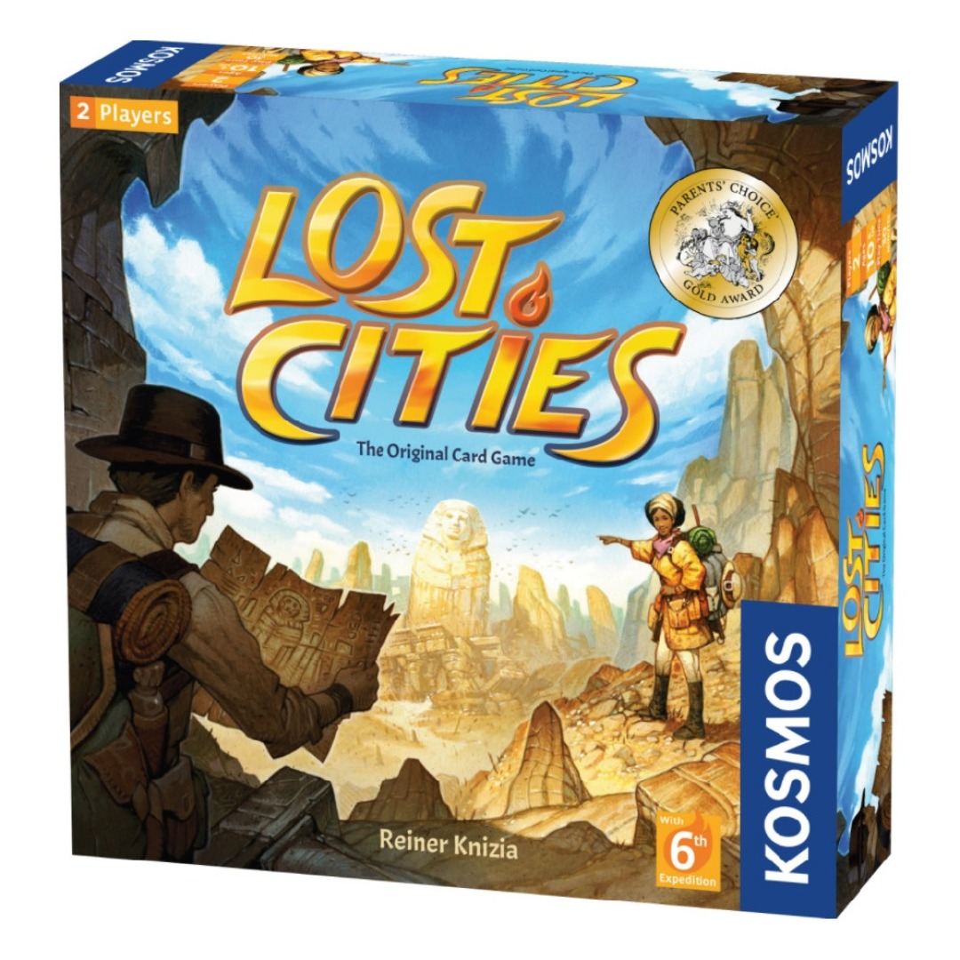 Lost Cities is a card game in the Kosmos two-player series. The game originally consisted of a single deck of cards of rank 2–10 in five different colors with three special “handshakes” (“HS” in scoring examples below) in each suit, but as of 2018 the game now includes six colored suits, with the sixth color being optional for gameplay. A game board is included to organize discarded cards and help players organize their card collections.