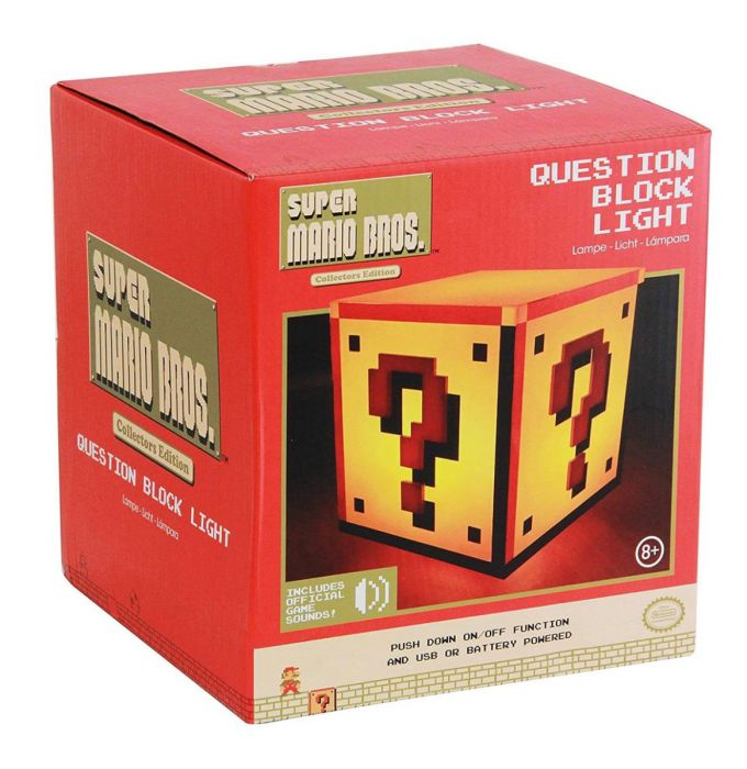 Featuring touch on and off and classic video game sounds, this amazing Super Mario Bros. Question Block Light will light up your room and your life at the same time! Plastic cube measures roughly 6 1/3-inches square, and features micro USB and instruction manual.
