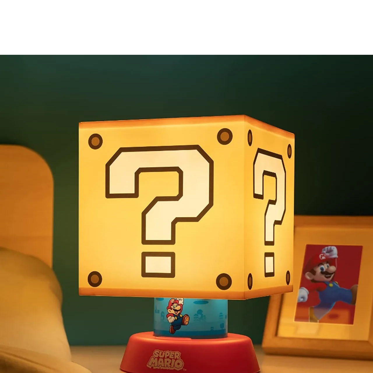 This Super Mario Icon Lamp is the perfect present for a Mario fan or anyone who loves gaming. Collectors of authentic Super Mario memorabilia will also welcome this addition into their collection. The question block-shaped lamp sits atop a red round base, complete with a beautiful blue strip decorated with icons from the world of Super Mario.